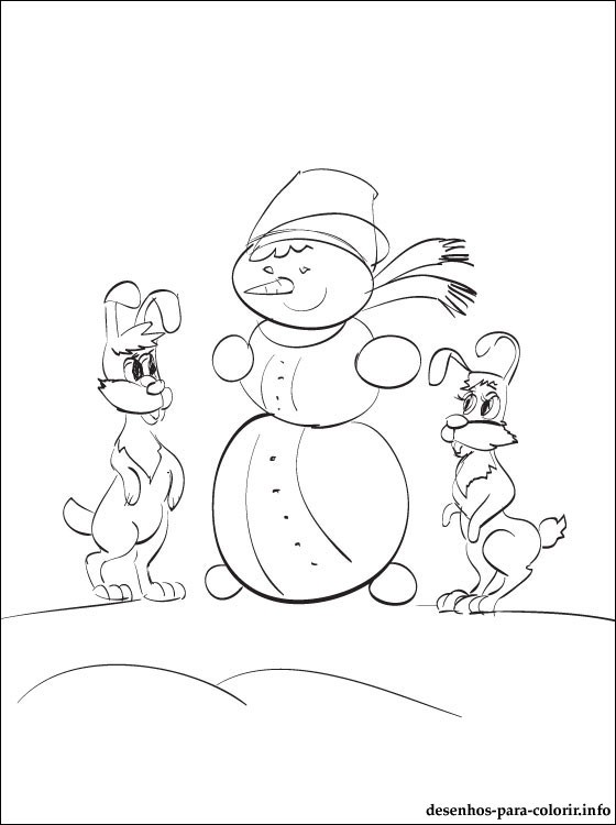 Imagem do boneco de neve com três coelhinhos para pintar e imprimir em sua impressora.