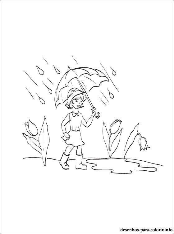 Desenho de menina com guarda-chuva para baixar e colorir. Imagem de menina na chuva para imprimir e pintar gratis, para crianças e para os amantes de primavera.